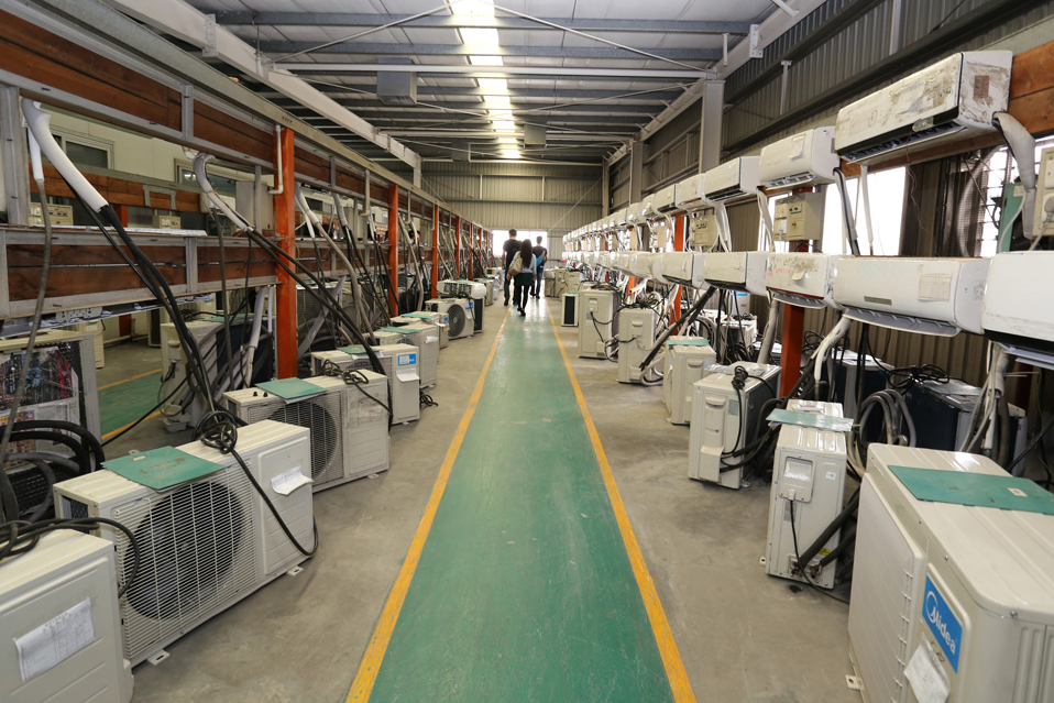 現(xiàn)在的空調(diào)生產(chǎn)線,出現(xiàn)的已不再是擁擠忙碌得跟陀螺似的產(chǎn)業(yè)工人。因為不少的“機器手”、“機器人”的出現(xiàn),勞動密集型的家電制造工廠被賦予了全新的“科技感”和“智能化”的色彩。在空調(diào)室內(nèi)、外機總裝線體的末端,裝箱、打包等繁重環(huán)節(jié),早已被機器人所取代。當(dāng)成品從生產(chǎn)線上完成之后,也是通過機器手直接搬運到流轉(zhuǎn)板上。